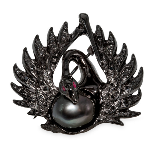 Прекрасный чёрный лебедь с таитянской жемчужиной и инкрустированный чёрными бриллиантами может носиться как брошь и как подвеска.